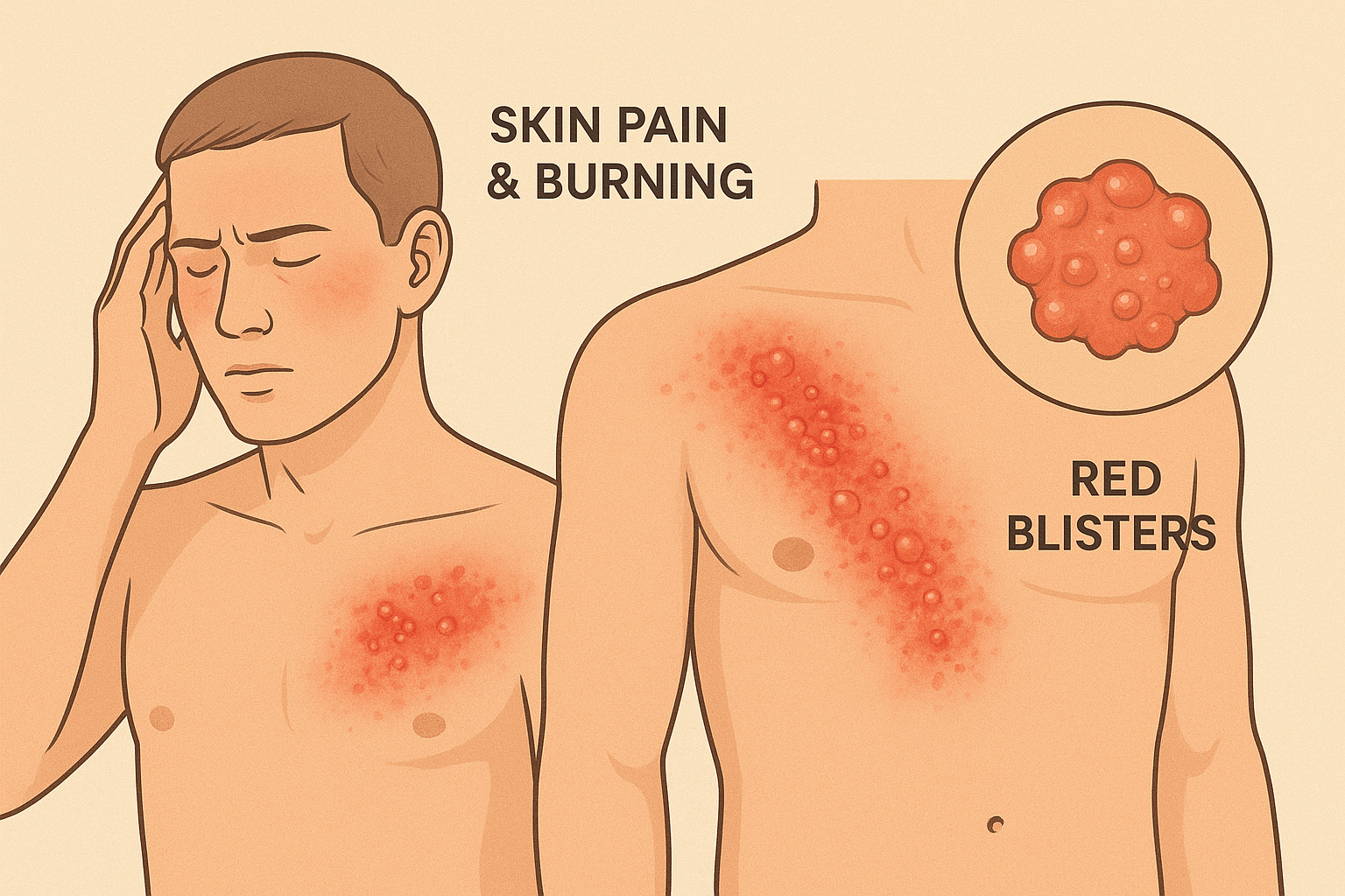✅ 피부 통증·작열감 – 통증이 먼저 시작되고, 이후 발진이 생김