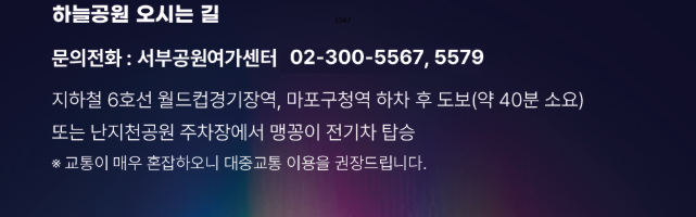 - 지하철: 6호선 월드컵경기장역, 마포구청역 하차 → 도보 약 40분