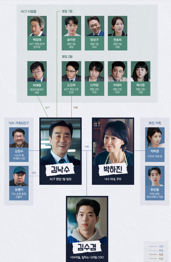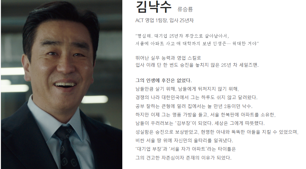 - 김낙수(류승룡) : 대기업 영업1팀 부장. 25년 차 직장인으로 ‘남들만큼’의 인생을 위해 달려온 인물.