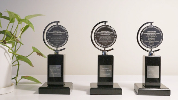 - 토니상 트로피를 조심스레 닦으며 미소 짓는 장면