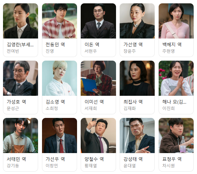 | 장윤주 | 가선영 | 회장의 의붓딸이자 교수. 권력과 감정을 이용하는 소시오패스적 빌런. |