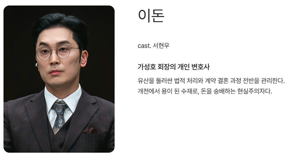 | 서현우 | 이돈 | 가성 그룹의 개인 변호사. 냉철하고 돈 중심적 현실주의자. |