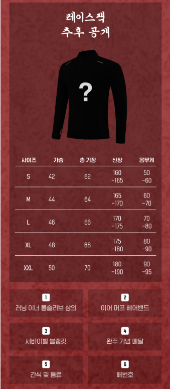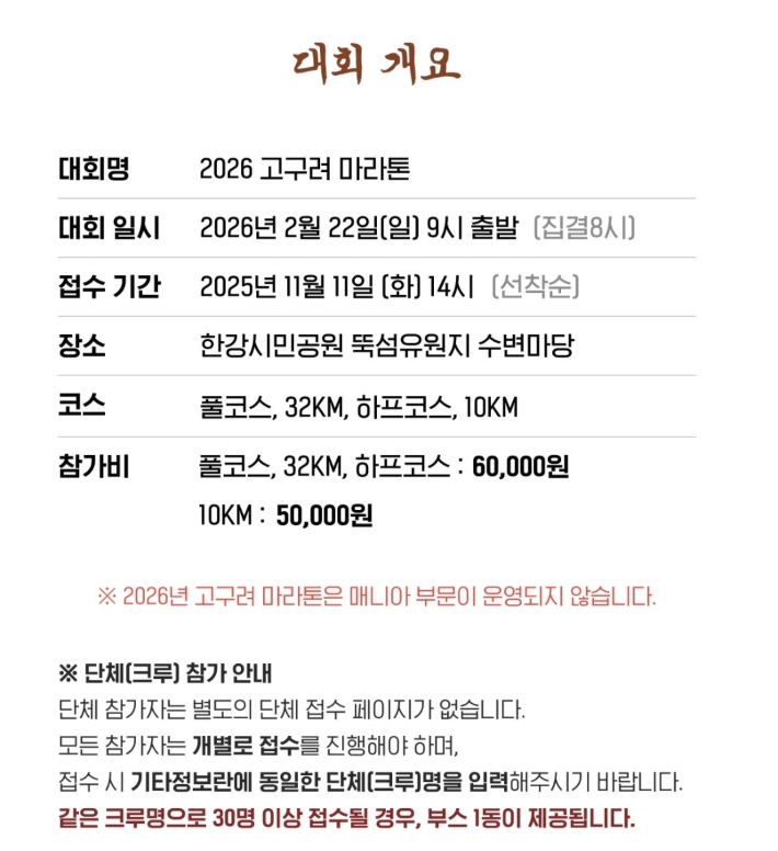 - 크루참가: 동일 크루명 30명 이상 접수 시 부스 제공 (보온·짐보관 용이)