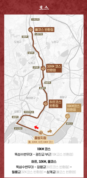 | 풀코스(42.195K) | 뚝섬 → 상계교 반환 → 골인 | 한강 직선로를 끝까지 달리는 본격 레이스 |