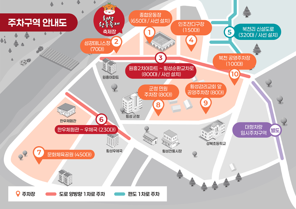 - 임시주차장: 횡성공설운동장, 군청 뒤편 공영주차장