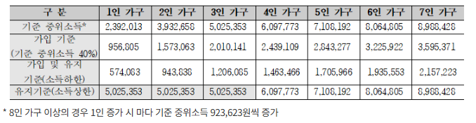 - 가구 단위 기준 중위소득 검증 (8인 가구 이상은 1인 증가 시마다 923,623원씩 상향)