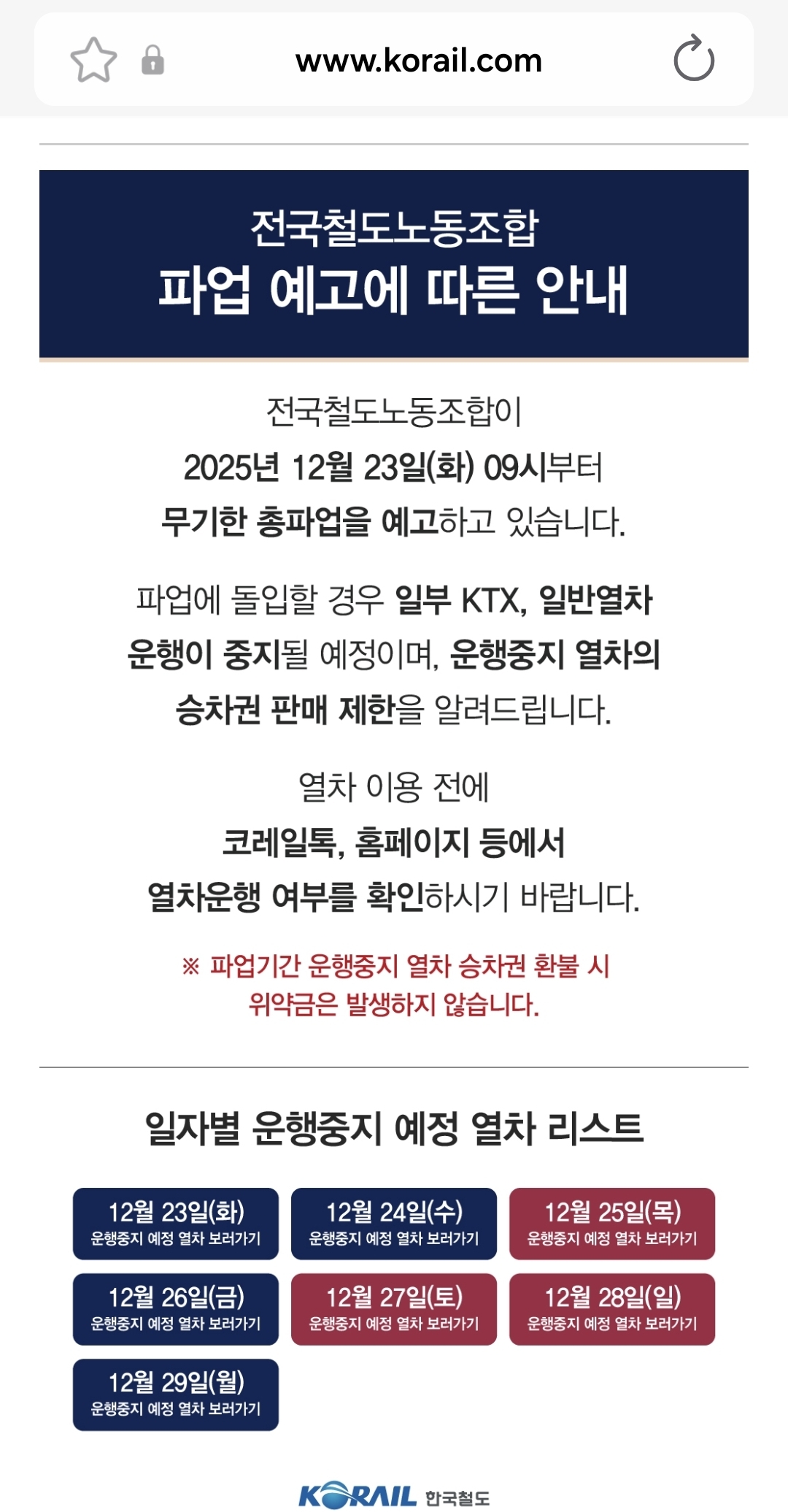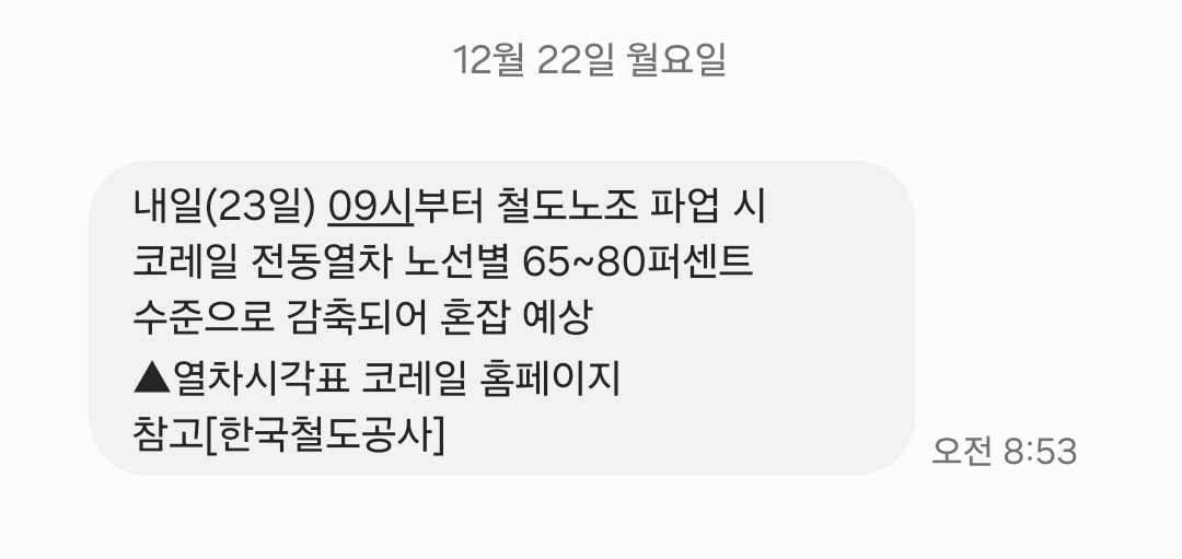 12월 23일(화) 오전 9시부터 철도노조 파업이 예고되면서
