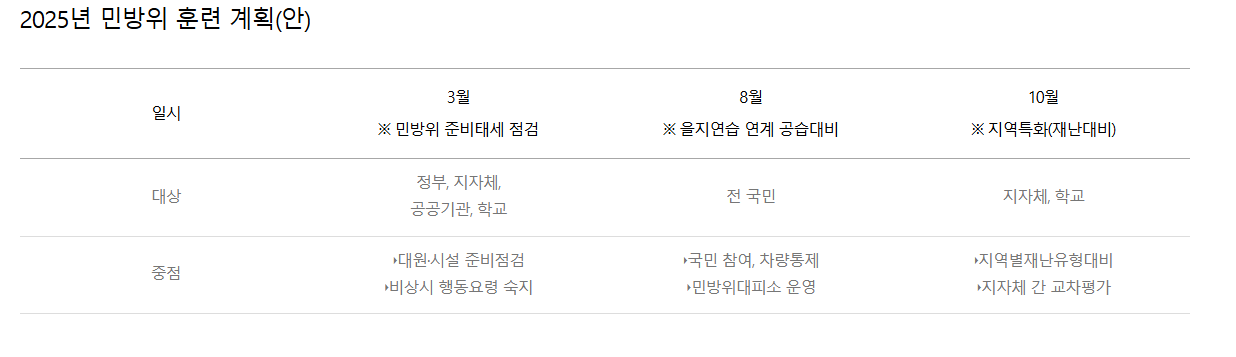- 훈련 대상 : 민방위 1~4년차, 각 시·군·구 공고 기준