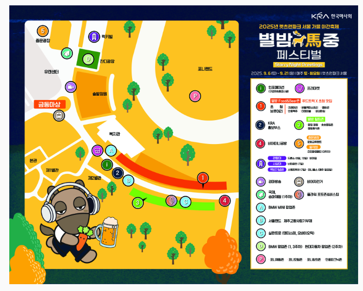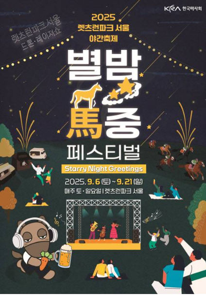 **한국마사회가 주관하는 ‘2025 렛츠런파크 서울 가을야간축제 – 별밤마중 페스티벌’**은 드론쇼, 버스킹, 푸드트럭 등 다채로운 프로그램으로 관람객을 맞이합니다.