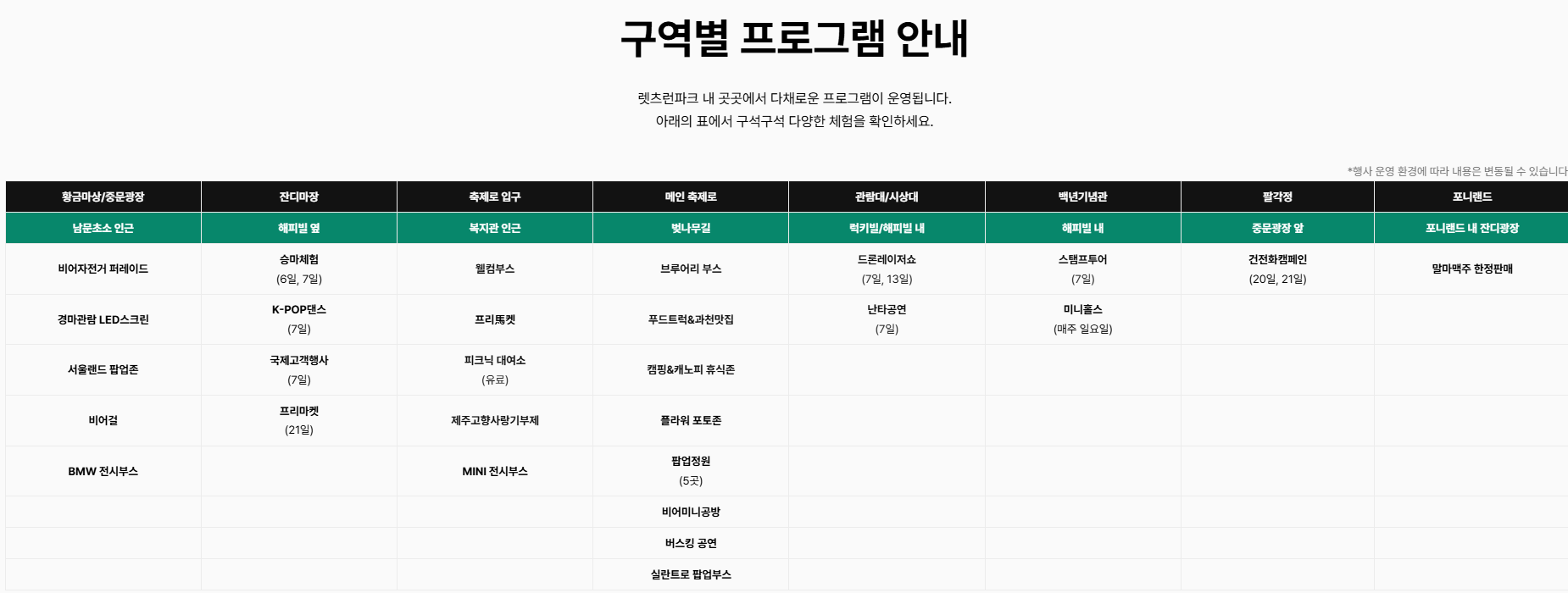 (중문광장, 황금마상, 백년기념관, 팔각정 등 주요 공간에서 다양한 프로그램 운영)