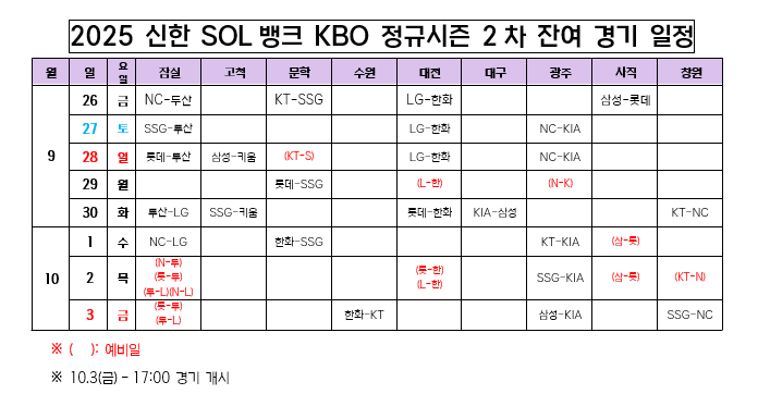 특히 개천절(10월 3일) 경기는 구단 이동을 고려해 오후 5시에 편성되었습니다.