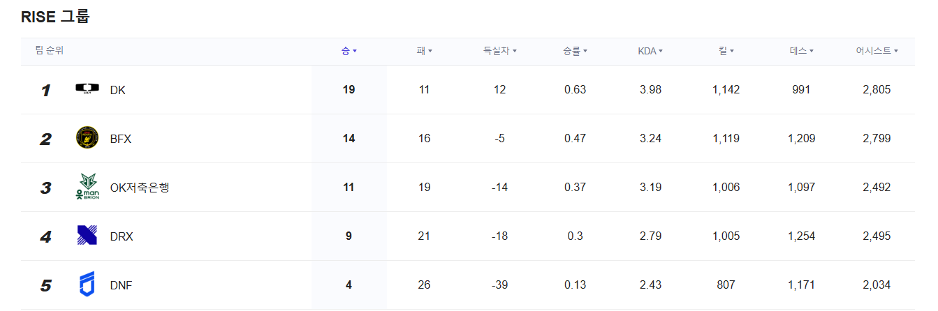 포스팅 작성일인 9월 12일 현재 순위는 레젼드 그룹에서는 젠지가 29승으로 1위, 라이즈 그룹에서는 19승으로 DK가 압서고 있습니다.