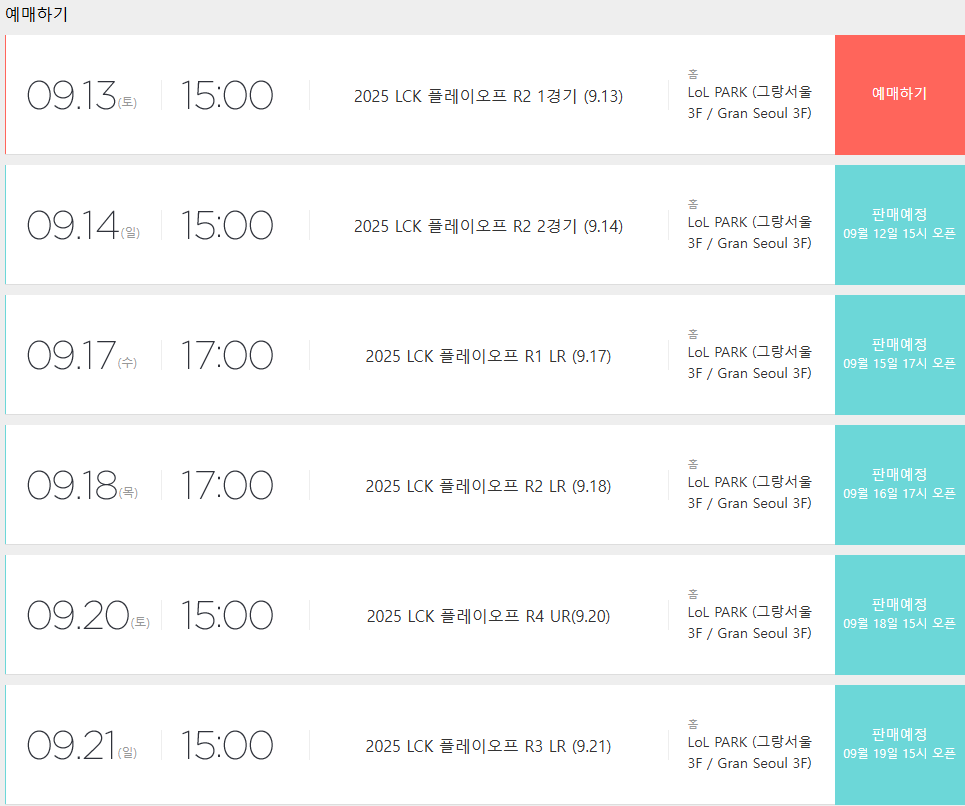 🔹 플레이오프 예매 일정 (LoL PARK / 종로 그랑서울 3F)
